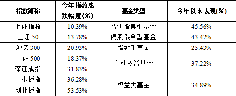 而公募基金整体交出了一份不弱的成绩单,上演“炒股不如买基金”的实力。Wind资讯数据显示,剔除暂时没有披露12月16日净值的基金,分级基金仅算母基金,截至12月16日,权益类基金(包括混合型、股票型、指数型;剔除今年新成立基金、分级基金仅计算母基金)平均收益率为34.89%,整体表现好于上证指数、沪深300、深证成指。