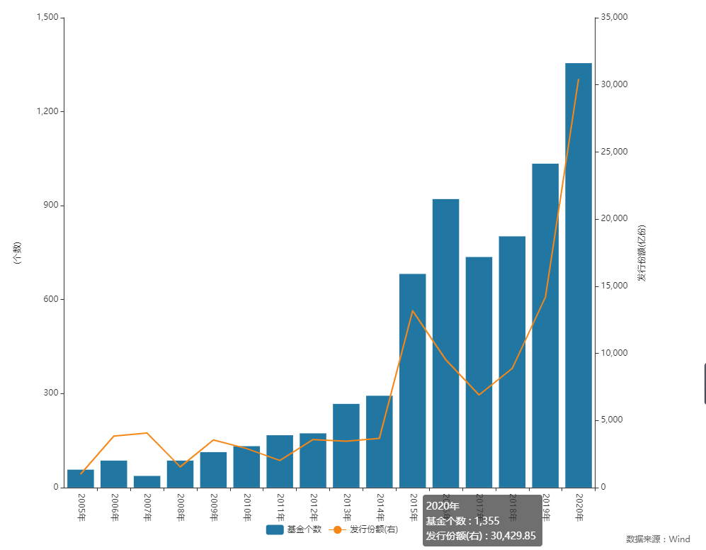 这是中国基金业历史上第一次出现一年新基金的成立规模超过3万亿元。同时,成立基金数量也是历史最高值。