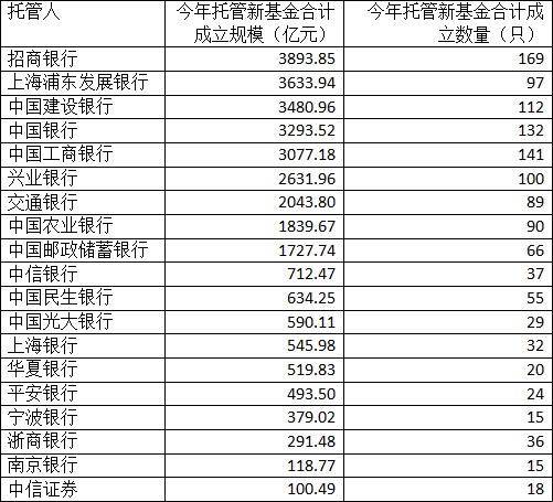 数据显示,从托管机构来看,托管今年新基金规模最大的是招商银行,达到3893.85亿元。而托管新基金只数最多的是工商银行,达到141只,其托管新基金规模也达到3077.18亿元。此外,浦发银行、建设银行、中国银行托管新基金合计成立规模也较高,均超过3000亿。