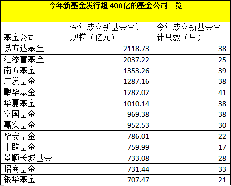 据基金君数据统计显示,今年发行新基金最大赢家要数易方达和汇添富两家公司。其中,易方达基金合计成立了38只新基金,合计募集规模为2118.73亿元;而今年成立10只百亿爆款基金的汇添富基金,今年新发基金合计成立规模达到2037.22亿元,这两家公司双双破两千亿。