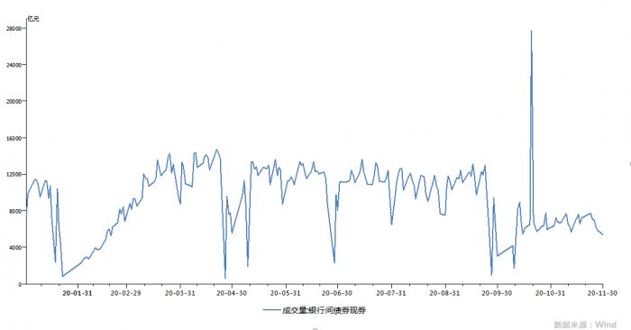 值得一提的是,银行间债券现券日均成交量在10月、11月同比连续下降,降幅均超过30%;交易所债券现券日均成交量在9月、10月、11月同比连续增长,且幅度较大。