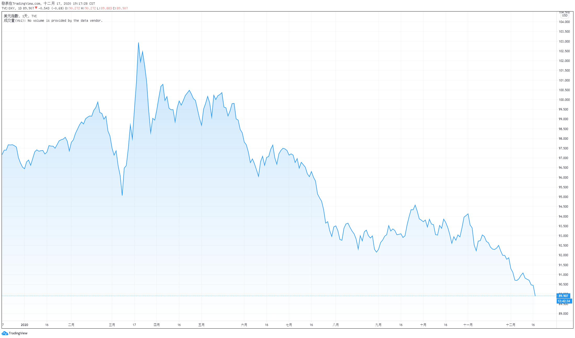 12月17日,美元指数延续下跌态势,跌破90关口,创2018年4月以来新低。