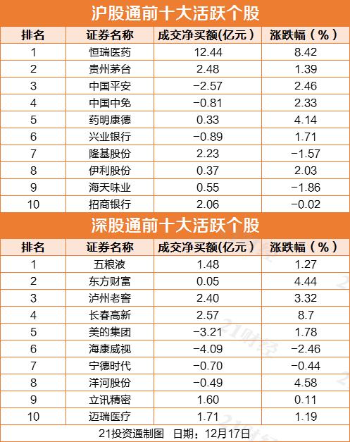 而十大活跃个股方面,恒瑞医药净买入12.44亿,长春高新净买入2.57亿,贵州茅台净买入2.48亿,泸州老窖净买入2.40亿。海康威视、美的集团、中国平安被净卖出额居前,分别为4.09亿元、3.21亿元和2.57亿元。