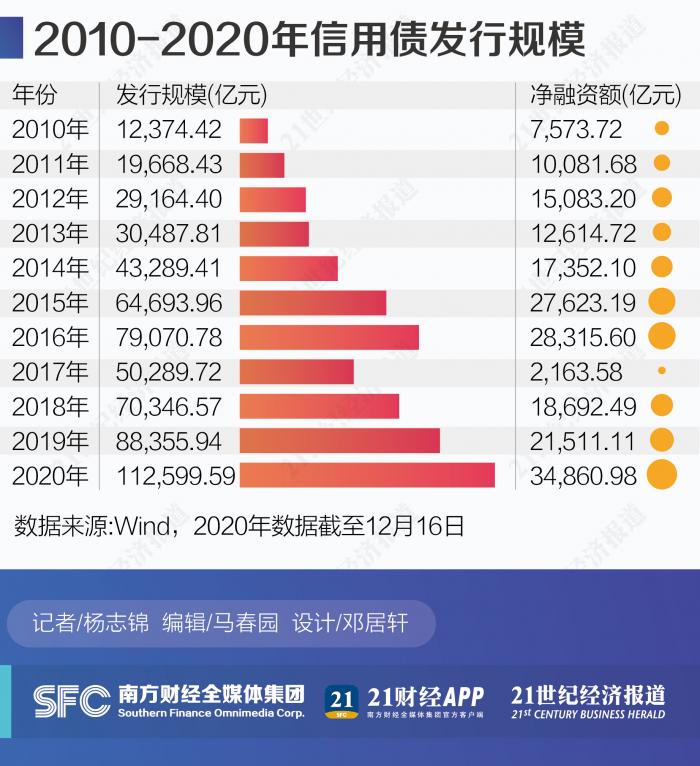 在疫情背景之下的2020年,信用债(包括企业债、公司债、中票、短融和PPN,下同)发行规模创出新高。21世纪经济报道记者根据Wind数据统计显示,截至12月16日,今年信用债发行规模高达11.2万亿,净融资规模为3.5万亿,双双创出历史新高。其中,信用债净融资规模超额完成年初目标。