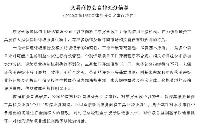 除了,对东方金诚予以警告、暂停其债务融资工具相关业务3个月(暂停业务期间,不得承接新的债务融资工具评级业务)之外,还责令其针对本次事件中暴露出的问题进行全面深入的整改;对时任总经理金永授予以通报批评;对评级总监刚猛予以通报批评;对相关评级项目组长高路予以诫勉谈话。