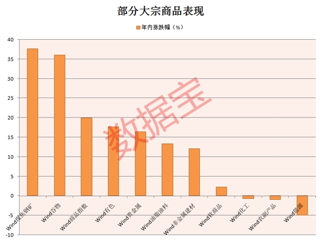 从wind计算的商品年内表现看,wind商品指数涨20%,其中煤焦钢矿、谷物指数年内累计上涨幅度超35%,有色、贵金属涨幅均超过了15%,能源指数近期虽有所反弹,但仍为跌幅最大指数。
