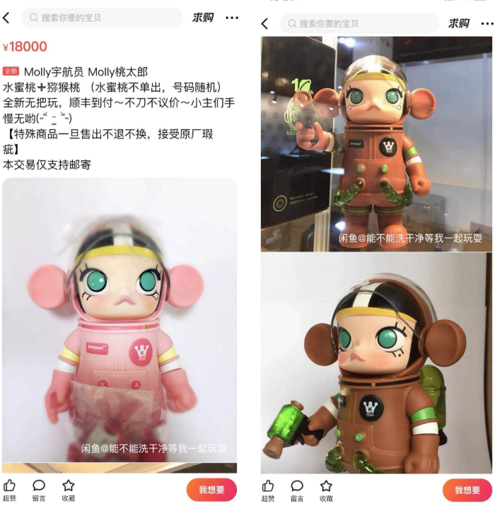 锅巴以她收藏的其中两个限量版的娃娃举例,她当时有事情没去线下店排队买,后来在咸鱼收了两个,原价一个800多,她加价到1000多收来,给个人家个辛苦费。她也没想到现在这两个娃娃现在成绝版,两个一对儿之前闲鱼有标价小10000的,到现在已经有人出到18000了。她也表示,自己肯定不会把自己的藏品卖掉,但这种拥有的感觉,会让她觉得很值。