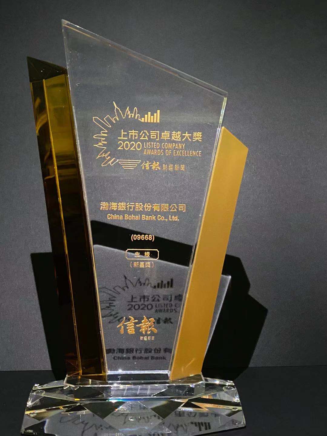 就在香港分行正式开业前一天,在位于国际金融中心二期12楼1201室的渤海银行香港分行总部办公区,香港分行副行长唐晓宁代表渤海银行从《信报财经新闻》颁奖代表手中接过了沉甸甸的印有“上市公司卓越大奖-主板新星奖”字样的奖杯(下图)。这也是渤海银行自今年7月间登陆香港联交所主板市场以来荣膺的首个重量级资本市场奖项。