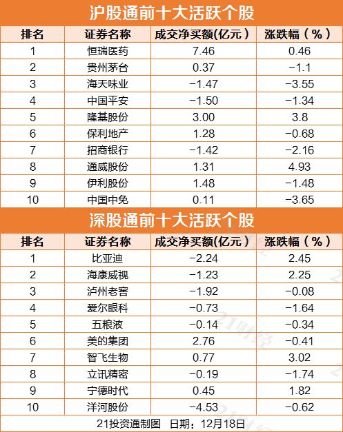 而十大活跃个股方面,洋河股份净卖出4.53亿,比亚迪净卖出2.24亿,泸州老窖净卖出1.92亿,中国平安净卖出1.50亿。恒瑞医药、隆基股份、美的集团、伊利股份净买入额居前,分别被净买入7.46亿元、3亿元、2.76亿元、1.48亿元。