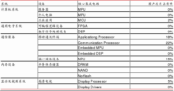 截至2018年,计算机系统中的MPU、通用电子系统中的FPGA和DSP、通信装备中的 Embedded MPU和DSP、存储设备中的DRAM和Nand Flash、显示及视频系统中的Display Driver等,国产芯片占有率几乎为零,其他核心芯片自给率亦非常低。由于芯片行业属于技术、知识和人才密集行业,企业需长时间的技术积累和经验沉淀获得技术突破,芯片国产化道路依然曲折。