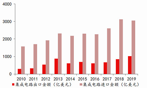 国内集成电路国产化仍有较大提升空间。当前中国大陆集成电路产业的快速发展尚不能完全满足日益增长的市场需求。2019年中国大陆集成电路进口额达 3055亿美元,是目前进口金额最高的商品,同期中国大陆集成电路出口额为1016亿美元,贸易逆差约2040亿美元,国内集成电路国产化仍有较大提升空间。