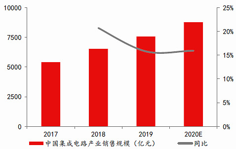 国内市场需求旺盛叠加国产化率提升,国内集成电路市场增速远超全球水平。受益于国内巨大的市场需求和稳定的经济增长,中国集成电路产业销售额由2012年的 2158亿元增长至2018年的6531亿元,年均复合增长率达 20.27%。2020年国内集成电路产业规模有望达到8766亿元,同比增长15.92%,远超全球5%的增速,需求旺盛叠加国产化率提升,国内集成电路行业有望延续景气。