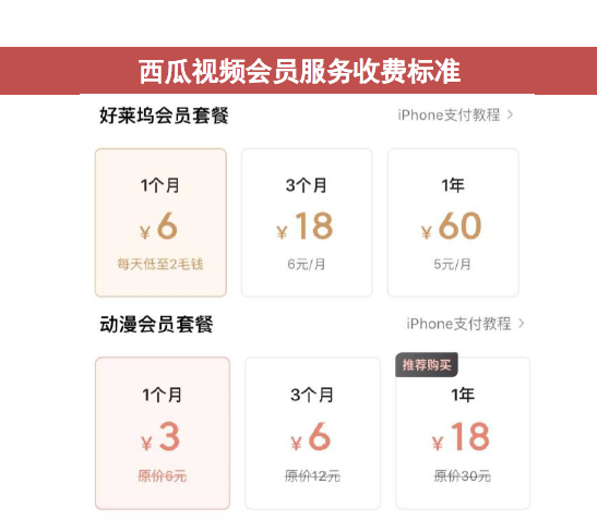 在视频内容层面的Battle只能说是正面的厮杀,对于已经深耕多年的优爱腾等而言或许暂时还造不成太大的威胁,真正威胁到他们的是西瓜视频的商业模式,不同于优爱腾等靠会员为主要收入来源,西瓜大头的收入在于广告,会员只有动漫和电影这两块,且会员费很低,这意味着西瓜上很大一部分的影视资源是免费看的。