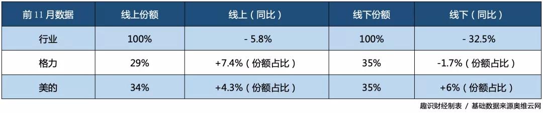 如上图所示,前11月空调线上集中度有所提升,格力、美的市场份额占比分别提升7.4%、4.3%,基本可抵消线上衰退。但按照行业下滑幅度以及市占份额估算,前11月,格力、美的线下销额或同比减少35%、29%。