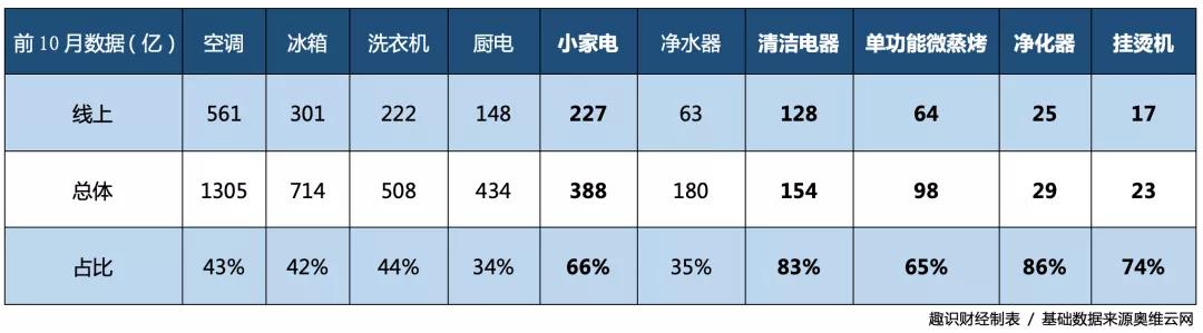 如上图所示,空冰洗等传统大家电线上占比基本维持在40左右,而小家电、清洁电器的线上销额已经升至65%、83%。简言之,线下依然是传统大家电的主战场;而线上则是功能性小家电的天下。