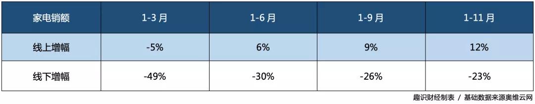 根据奥维云网数据,2020年前11月,整个家电行业线上销额同比上升12.46%,线下销额同比下降22.89%。