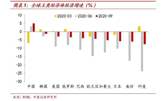 会议指出,“我国成为全球唯一实现经济正增长的主要经济体,三大攻坚战取得决定性成就”,这是对我国今年防疫和经济工作的肯定。我国最早受到新冠疫情冲击,由于疫情防控封锁,经济活动趋于停滞,1季度GDP增速仅为-6.8%,在主要经济体中最低。但也得益于有效的防控隔离措施,疫情快速得到控制,复产复工得以迅速推进,我国经济也随之持续修复,三季度增速已经达到4.9%,在主要经济体中唯一实现正增长。