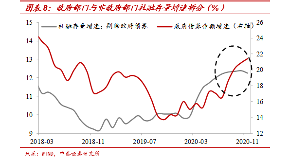 其实今年下半年来信用的投放其实也已经在收敛了。比如6月份以来银行信贷已经回归到正常增长通道,社融的短期高增长主要来自政府债券的大量发行,剔除政府债券后的社融增速也已经放缓了。