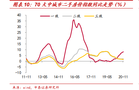 回顾今年房地产市场,更多是核心城市销售火爆、房价上涨,和货币放水有较大的关系,中小城市上涨幅度相对较小。今年3月份以来,各地二手房价格走势出现持续分化,一线城市持续走强,二三线城市缓慢走弱。销售端也是类似,截至12月中旬,一线城市商品房成交面积累计同比达到11%,而三线城市仅为-3.2%。