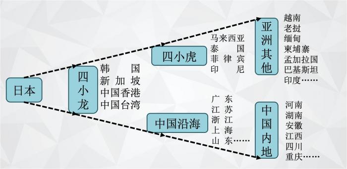 上个世纪90年代以来,日本在东亚这些国家构成了以日本为首的“雁阵模式”。有一些国家控制了产业链的高端环节、有一些国家在产业链的中端、低端环节,这是国际内部的产业分工。