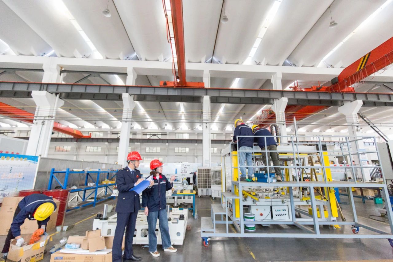 △2020年10月10日,在江苏南通如皋市瀚皋机械设备有限公司生产车间内,税务局工作人员在对出口产品订单量及生产情况进行实地了解。