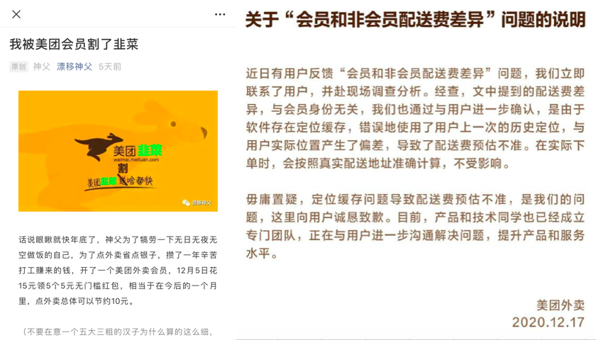 最近,网友“漂移神父”写的一篇《我被美团会员割了韭菜》文章在各大社交圈刷屏,文中记录了他在美团点外卖时发现,同一店铺、同一时间,用两部手机点单,其中开通了美团外卖会员的配送费,竟然比未开通会员的配送费要贵,直指美团“大数据杀熟”的行为。