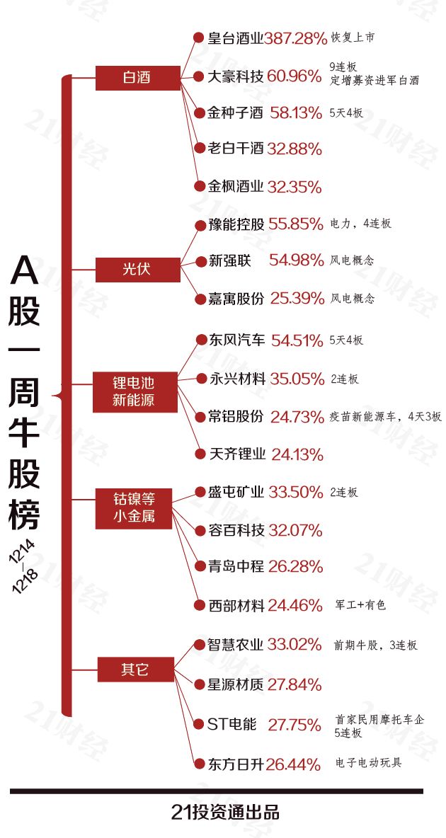 纵观20大牛股,消费中的酿酒、食品饮料,周期中的煤炭、有色,以及新能源板块备受市场追捧。