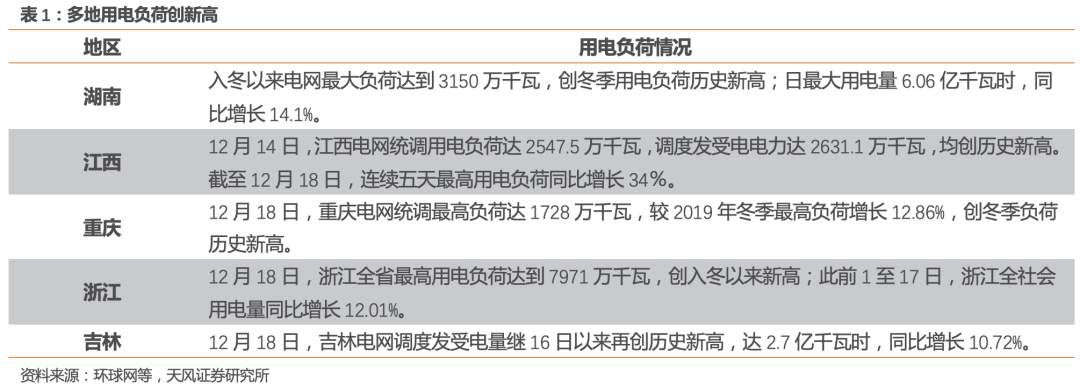 迎峰度冬背景下,多地区用电负荷创新高。湖南、江西、重庆等地入冬以来用电负荷均创历史新高,在高压负荷下,多地电力供应出现短缺,以湖南为例,可供电力存在300至400万千瓦缺口、日可供电量存在0.1至0.2亿千瓦时缺口。