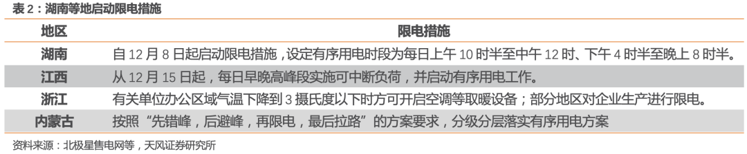 用电短缺严重,部分地区启动“限电”。在用电负荷连创新高的压力下,以湖南、江西、浙江为代表,多省市出现限制用电情况。以湖南为例,12月7日,湖南省发改委发布的《关于启动2020年全省迎峰度冬有序用电的紧急通知》,明确电力供应存在较大缺口,启动有序用电。