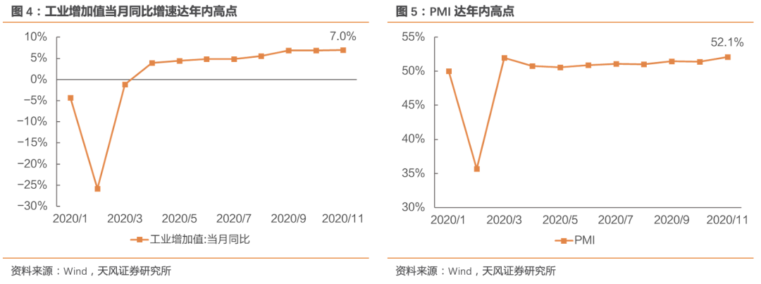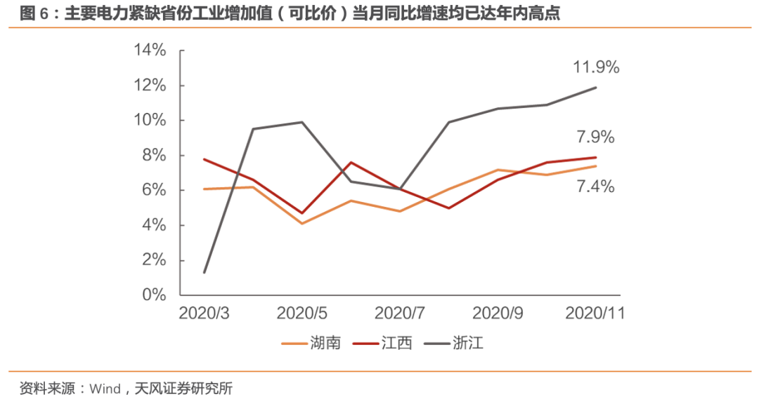 需求端因素二:产业复苏强劲。产业复苏是今年以来我国经济的主基调。11月产业复苏力度进一步加强,工业增加值当月同比增加7%,PMI达52.1%,均创年内新高。限电省市中,湖南、江西、浙江工业增加值当月同比增速分别达到7.4%、7.9%和11.9%,同样达年内高点,产业复苏的持续走强是末端电力需求超负荷的重要支撑力。