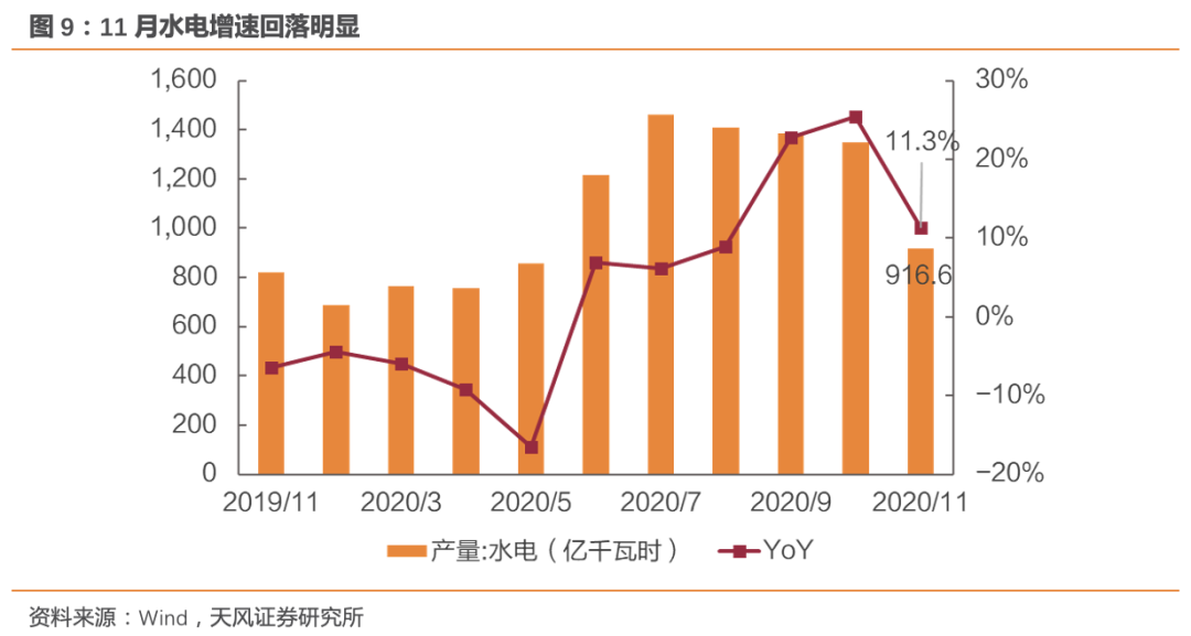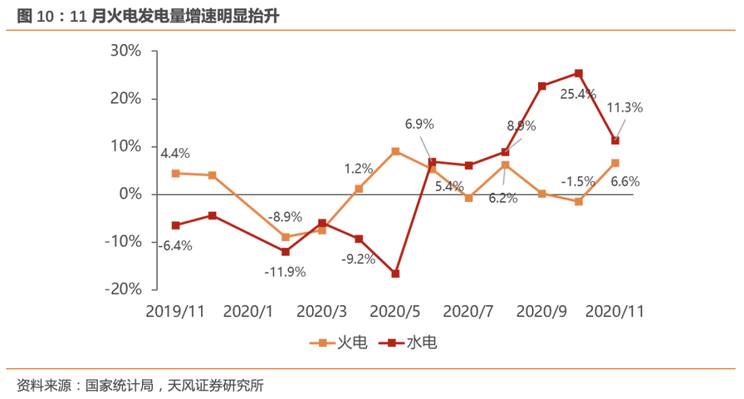 需求景气走高,助力利用小时抬升。利用小时层面,冷冬以及产业复苏的强趋势下,末端用电需求景气抬升明显,上网优先级较低的火电在需求强劲复苏的带动下,利用小时将呈现出更大的弹性。水电丰期结束之后,11月火电发电量在已出现明显回暖态势,11月火电产量同比增加6.6%,增速环比抬升8.1个百分点,实现转正。