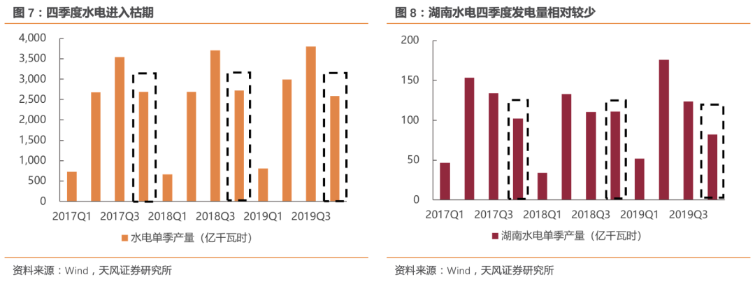 供给端因素:水电枯期,外送有限。冬季为水电枯期,2017至2019年四季度水电发电量占全年比例平均为27%,其中湖南平均占比为23%,且经历了来水异常丰沛的丰期之后,11月水电增速回落明显,同比增速大幅收窄14个百分点。对于较为依赖外送水电的江浙沪,以及省内水电占比较高的湖南,在冬季用电高峰时期供应端增量有限。另外,火电机组的停运维修同样是重要原因,湖南部分火电机组相继故障停运,影响电力供应约102万千瓦。