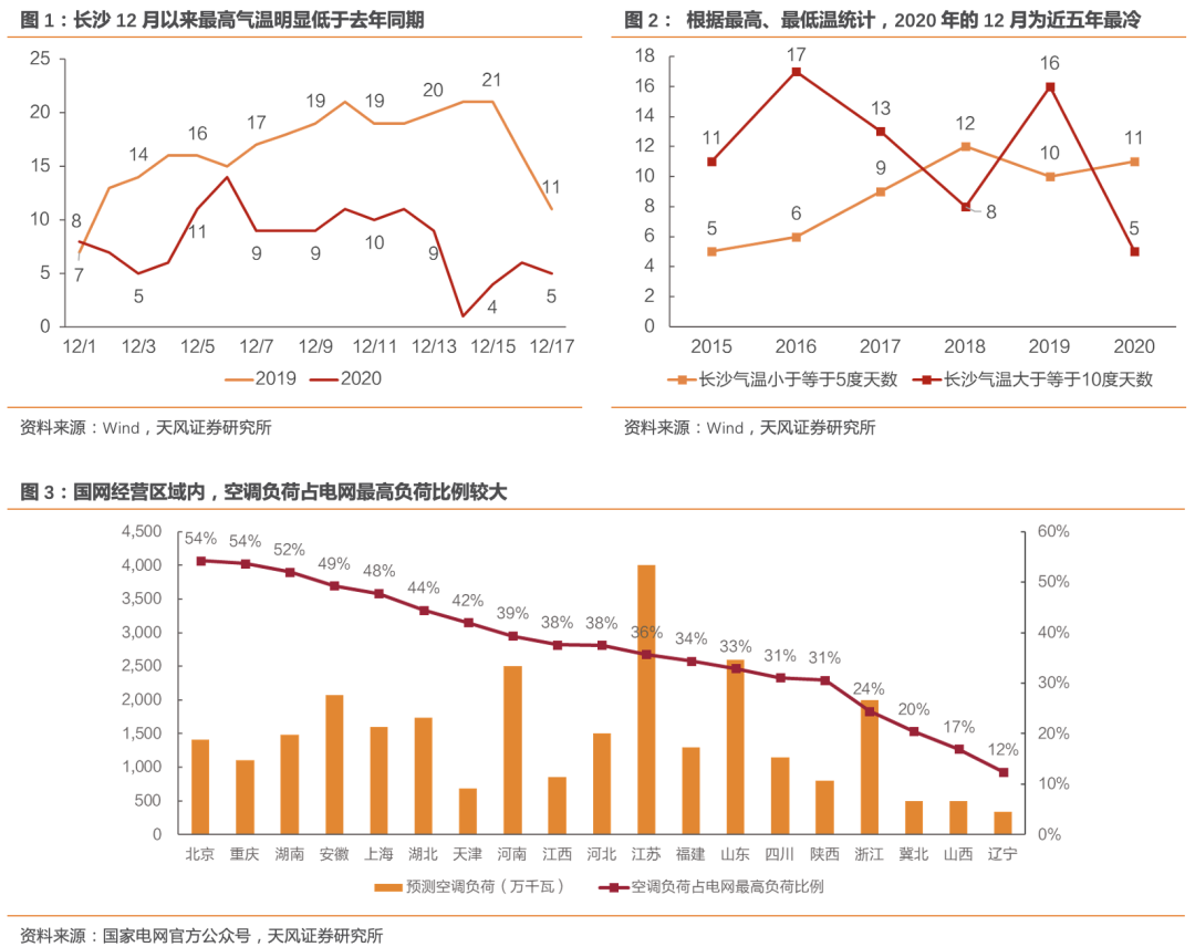 需求端因素一:寒冷天气刺激空调负荷陡升。根据中国气象局预测,今年冬季影响我国的冷空气活动频繁,势力偏强,12月影响我国的冷空气过程主要有五次,接近常年略多,2020年我国冷冬特征明显。以长沙为例,入冬以来,湖南全省平均气温比去年同期低3摄氏度,低温天气明显增多,12月1日至17日,低于等于5度的天数达11天,高于等于10度的仅有5天。冷冬刺激下空调负荷明显增加。空调负荷在高峰用电负荷中占比较高,极端天气下空调用电负荷的陡升将给电网系统带来较大压力,根据国网数据,国网经营区域中空调负荷占电网最高负荷比例均值达36.7%,其中湖南、江西、浙江占比分别为52%、37.6%以及24.4%。