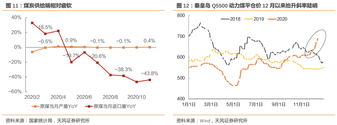 利用小时层面,冷冬以及产业复苏的强趋势下,末端用电需求景气抬升明显,对于上网优先级较低的火电机组,利用小时将呈现出更大的弹性。水电丰期结束之后,11月火电发电量在已出现明显回暖态势,同比增加6.6%,增速环比抬升8.1个百分点实现转正。煤价层面,短期来看,此次“限电”事件的背后是极端的严寒以及产业的复苏,这整体在需求端给动力煤价带来了进一步上行的压力。与此同时,在限产及进口限制压力下煤炭供给端持续疲软,11月煤炭产量同比增速仅0.4%,进口量同比降幅达43.8%。供需共振下煤价推高动力较强,12月以来秦皇岛Q5500动力煤价格上行斜率陡峭。