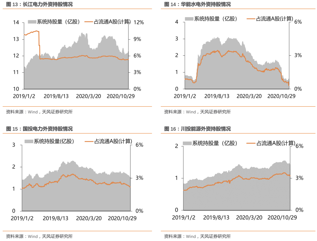 截至12月18日,剔除限售股解禁影响后,长江电力、华能水电、国投电力和川投能源外资持股比例分别为5.39%、0.34%、2.20%和3.25%。较年初(1月2日)分别变化-0.41、-2.87、-0.88和+0.11个百分点,较上周分别变化+0.04、-0.24、-0.06和-0.08个百分点。