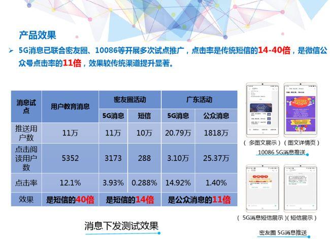 中国移动在密友圈,10086试点推广。推广测试效果显示,5G消息点击率较传统短信提升11倍~40倍,是微信公众号消息的11倍。