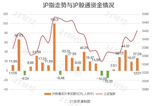 12月21日,A股持续走高,沪指收复3400点关口,创业板指涨超3.5%,两市成交量有所放大。