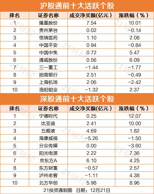 而十大活跃个股方面,隆基股份、京东方A、北方华创、五粮液净买入额居前,分别被净买入7.54亿元、6.1亿元、5.98亿元、4.69亿元。海康威视、三一重工、洛阳钼业获净卖出居前,分别被净卖出5.26亿元、1.44亿元、1.32亿元。