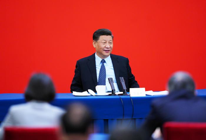 2020年5月23日,习近平看望参加全国政协十三届三次会议的经济界委员,并参加联组会,听取意见和建议。