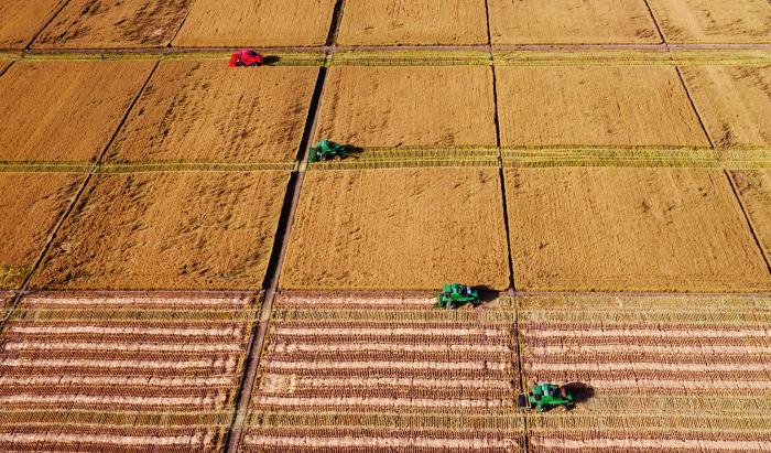 大农机在黑龙江省浓江农场收获水稻(2017年9月28日摄,无人机照片)。