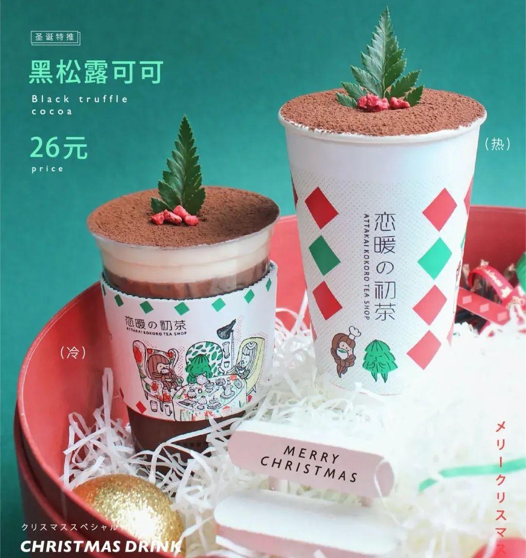 有的品牌,产品走极简风:恋暖初茶今年圣诞的作品是黑松露可可,用草莓冻干和树叶摆成的圣诞树造型装点浓郁可可和黑松露粉。