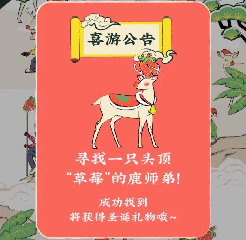 喜茶为圣诞季设计了一款“一鹿寻莓”的小程序游戏——寻找一种头顶草莓的鹿师弟,就有机会抽取“喜茶圣诞礼券”。