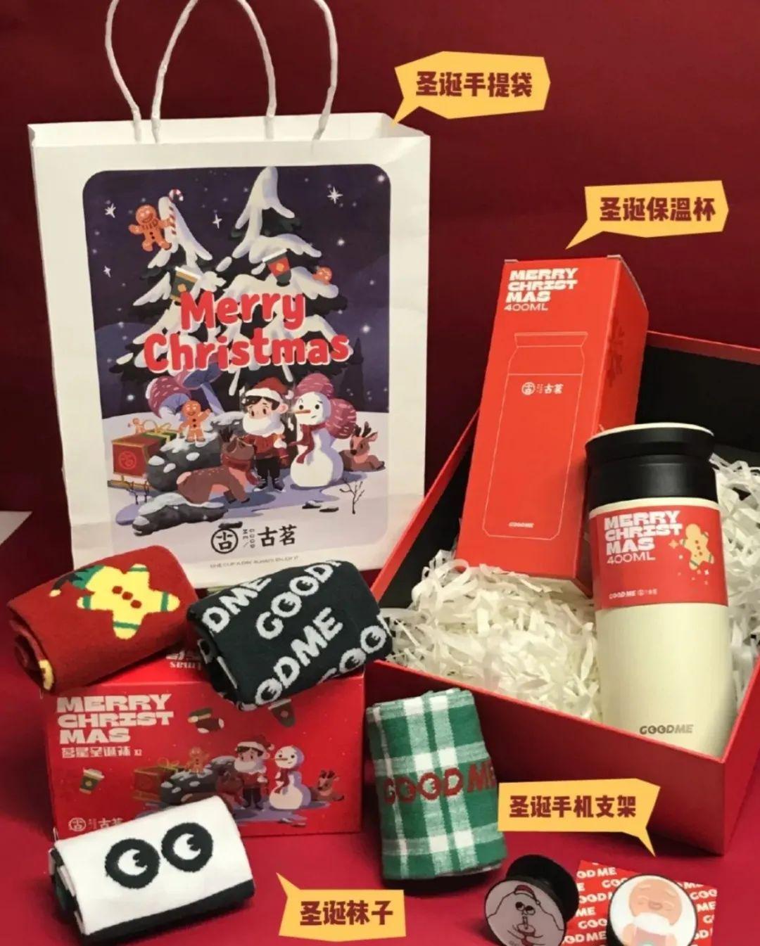 古茗推出了圣诞专属周边礼盒,包含保温杯、手机支架、圣诞袜等。
