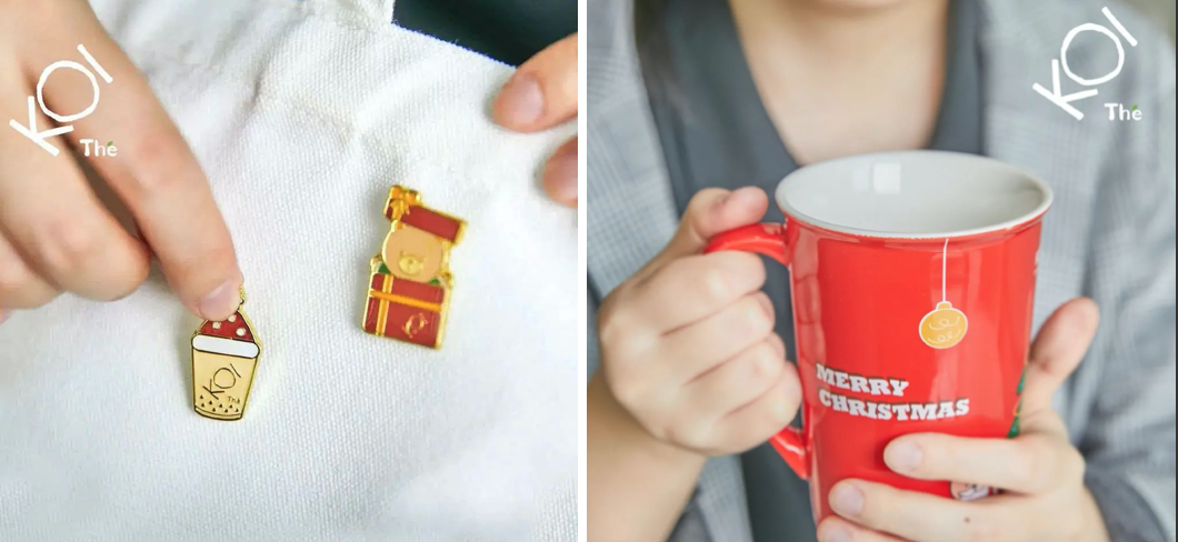 KOI则是准备了圣诞限定的徽章盲盒、保温杯和马克杯,这些限定周边需要顾客用KOI PLUS上积分兑换。