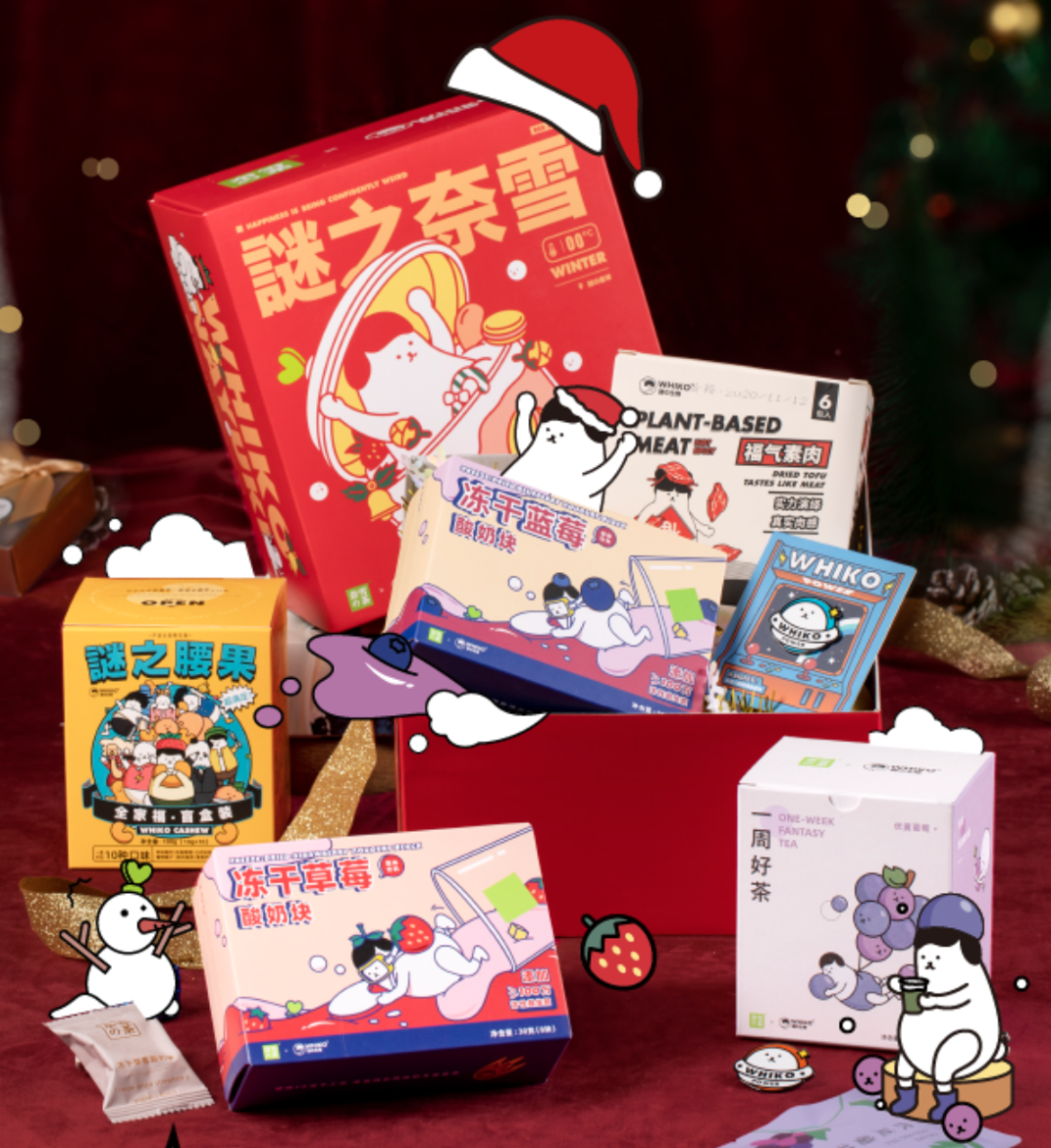 奈雪的茶还联合WHIKO推出一款圣诞零食礼盒,其中包含奈雪TOP1零食,首支水果乌龙茶礼盒以及WHIKO热卖零食,外表也换上了圣诞装饰。