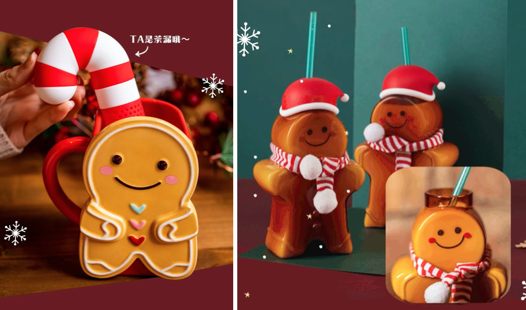 除此之外,星巴克还推出很多限定款,比如姜饼人造型的马克杯,还搭配了一个拐杖糖造型的茶漏。带着圣诞帽的姜饼人吸管杯,也是萌点十足。