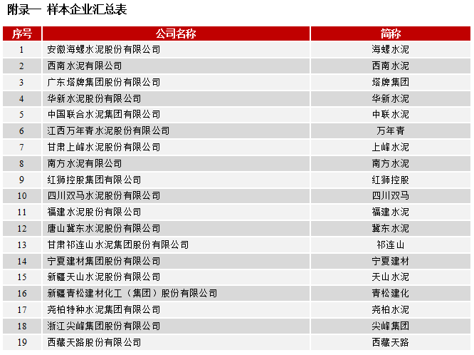 中证鹏元选取了水泥制造行业19家公司作为样本进行分析(见附录一,以下简称“样本企业”),包括14家上市公司和5家非上市发债企业。