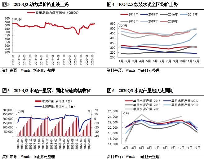 整体来看,投资修复为Q3水泥需求提供支撑,同时供给端偏紧政策持续,推动水泥自8月开始量价齐升。预计2020Q4采暖季环保政策对水泥供给形成严约束,加之2021年春节相对较晚、需求延长,2020Q4水泥供需关系有望温和改善,水泥价格或继续上行。Q3投资修复拉升水泥需求,同时,国家坚持以供给侧结构性改革为主线,打好污染防治攻坚战,不断推进错峰生产、节能减排、产能置换和矿山综合整治,供给端政策延续了偏紧总基调。受此影响,水泥库存在7月阶段性增加之后下降至低位,水泥行业量价齐升:2020Q3水泥产量6.76亿吨,超历史同期,2020年1-9月全国累计水泥产量16.7亿吨,同比下降1.1%,降幅收窄;水泥价格自8月以来整体上涨。成本方面,受下游钢铁、建材、化工等行业需求回升拉动,2020Q3国内煤价止跌后持续上涨,但对水泥行业压力有限。