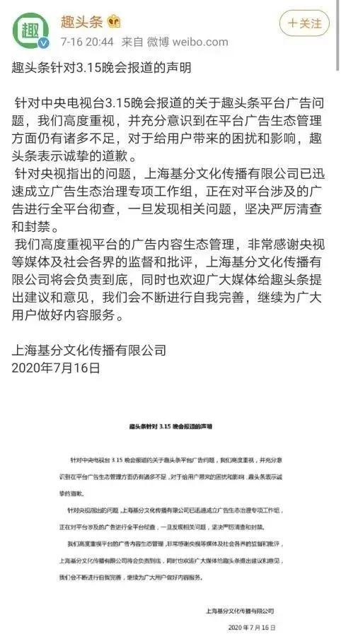 显然,趣头条也意识到了问题的严重性。7月16日,迟到了四个月的315晚会,并没有给期待者带来意想当中的猛料,不过去两年风光无限的趣头条,这次也被狠狠的点了名。耐人寻味的是,趣头条甚至在节目还没到曝光到它之前,抢先道歉,微博的措辞与态度也十分诚恳。