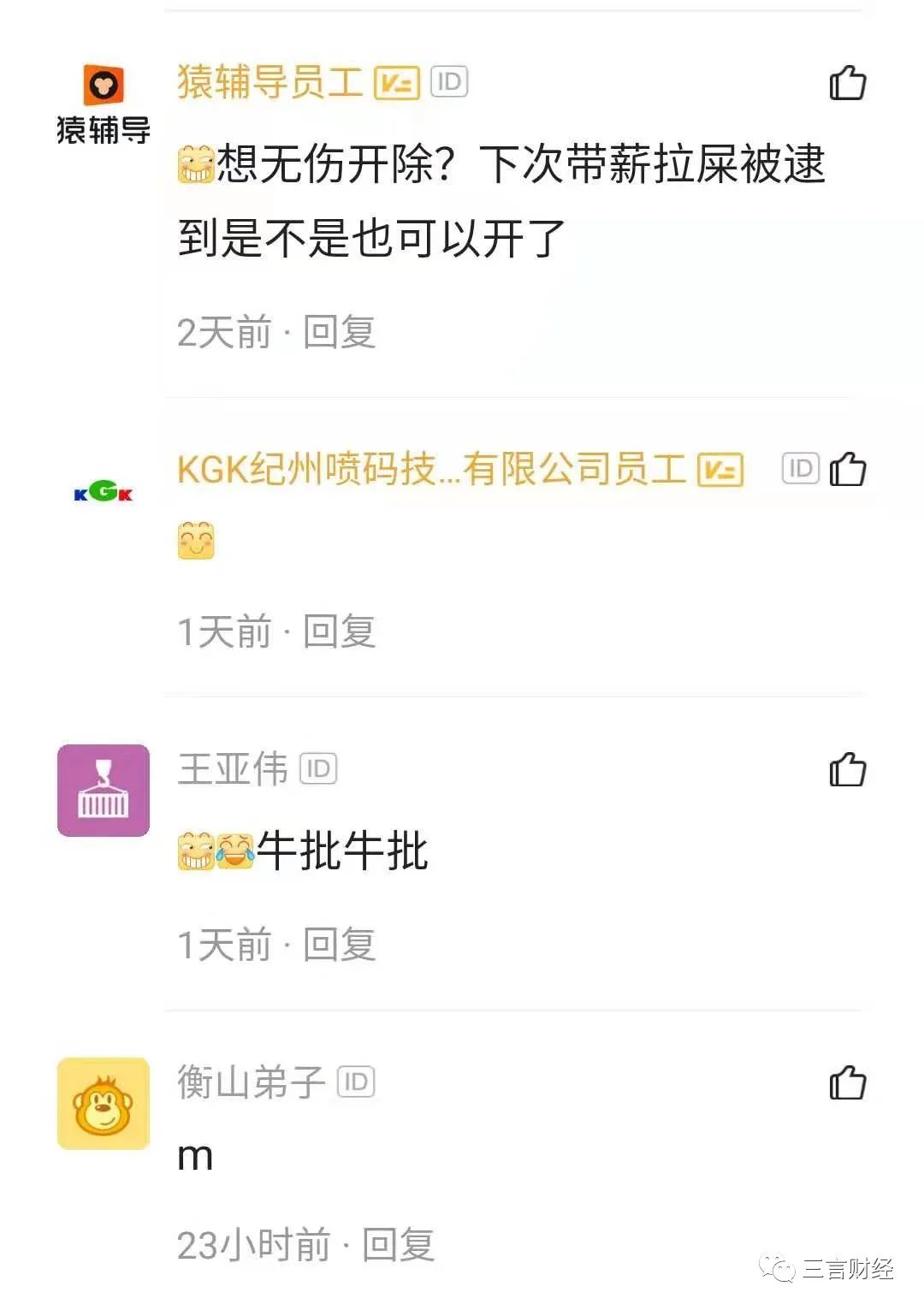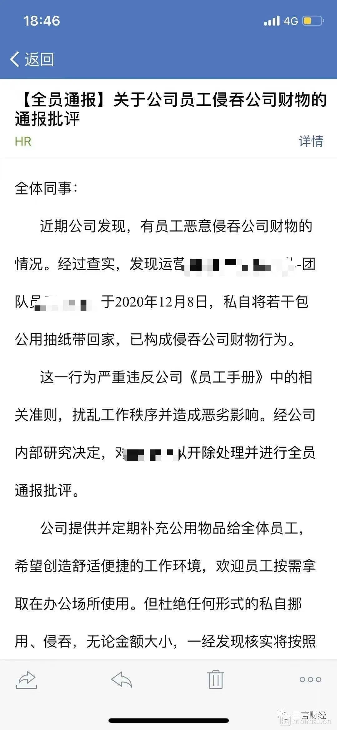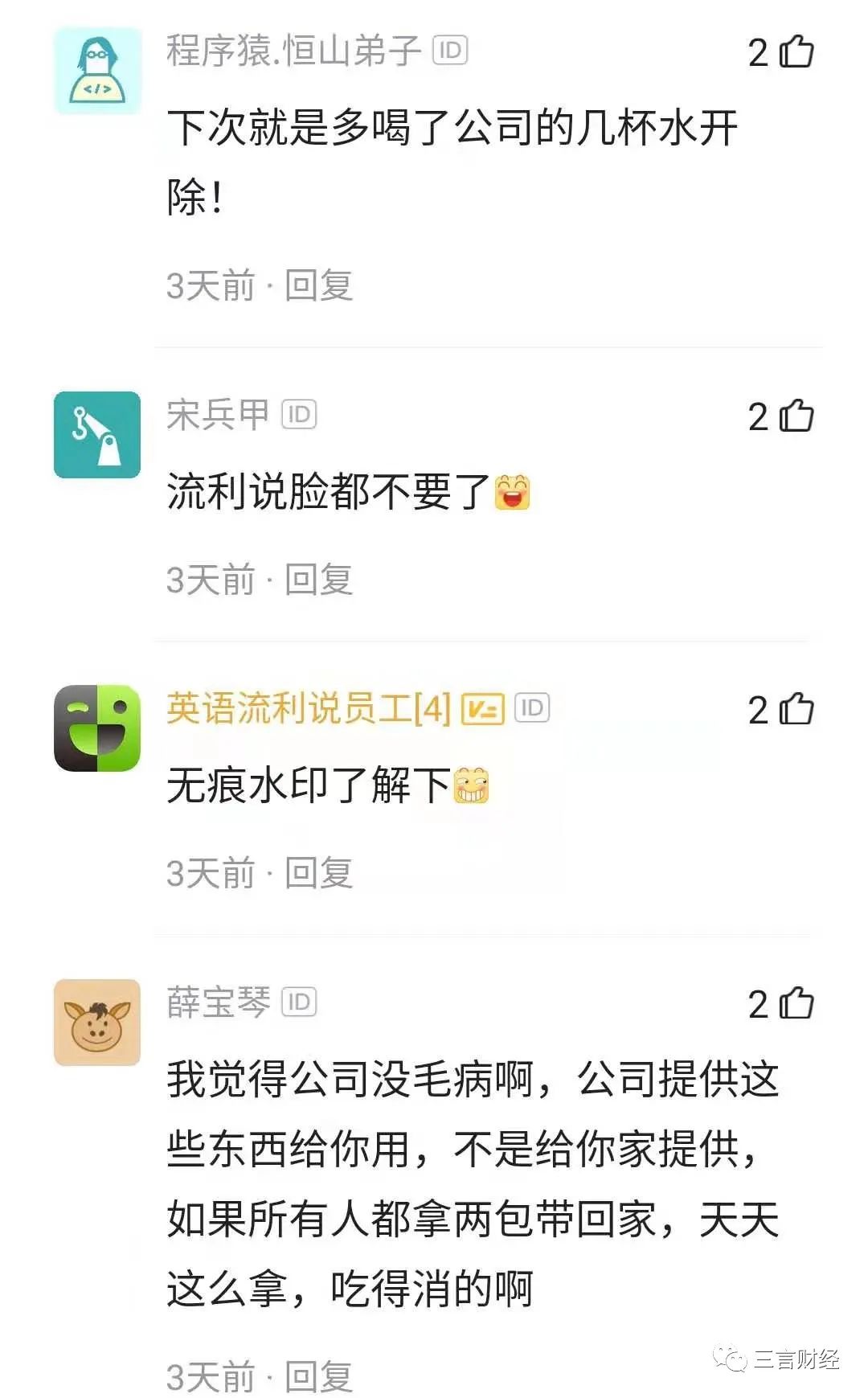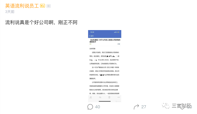 三言财经消息,近日有流利说员工爆料,公司发布全员通报称某员工于2020年12月8日私自将若干包公用抽纸带回家,已构成侵吞公司财务行为,故对该员工开除处理并进行全员通报批评。